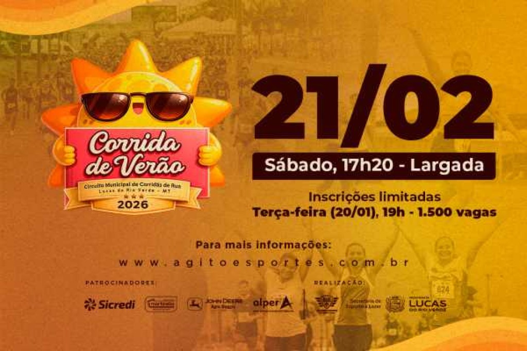 A temporada 2026 do Circuito Municipal de Corridas de Rua de Lucas do Rio Verde começa em fevereiro com a Corrida de Verão, primeira etapa do calendário esportivo do ano. A prova será realizada no dia 21 de fevereiro e contará com percurso de 5 km.