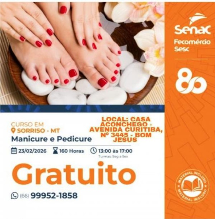 Aumentar a renda sempre é bom, né? Pensando nisso a Casa Aconchego em parceria com o Serviço Nacional de Aprendizagem Comercial (Senac ) está com as inscrições abertas para um curso de manicure e pedicure. Interessadas, acima de 18 anos, podem se inscrever pelo telefone (66) 99952-1858. São 25 vagas que serão preenchidas pela ordem de inscrição.