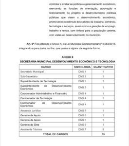 Já a Secretaria de Desenvolvimento Econômico e Tecnologia passa a contar com 19 cargos, voltados à gestão e incentivo de políticas públicas para geração de emprego e renda.