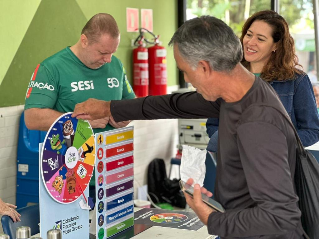 Nos atendimentos fazendários, os cidadãos puderam realizar cadastro e atualização no Nota MT, receber orientações sobre cidadania fiscal, com sorteio de brindes, além de negociar débitos de IPVA e emitir boletos para pagamento.