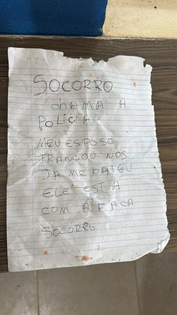 Os policiais militares foram acionados para atenderem a uma ocorrência de possível sequestro em uma residência no bairro Vida Nova II. No local, os militares encontraram um bilhete com a seguinte mensagem: “Socorro, chama a polícia. Meu esposo nos trancou e já me bateu. Ele está com uma faca. Socorro”.