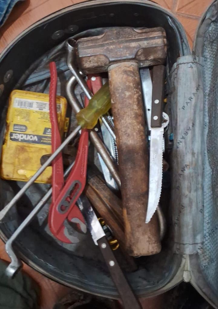 No veículo, foram encontradas ferramentas especializadas para remoção de módulos eletrônicos (chaves de fenda e de torque, alicates e marreta) acondicionadas em bolsa preta, além de roupas, calçados e chapéu de palha, que coincidem exatamente com as vestimentas utilizadas pelos suspeitos nos dias dos crimes, conforme identificado nas imagens de videomonitoramento de Canarana.